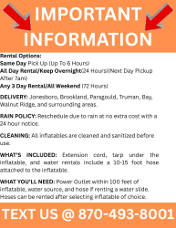 • WHAT YOU'LL NEED: Electric outlet within 50 feet of setup area, Water source and water hose if renting a water slide. (You can rent a hose for an additional charge)