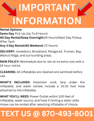 - RAIN POLICY: Reschedule due to rain at no extra cost w/24 hour notice.
